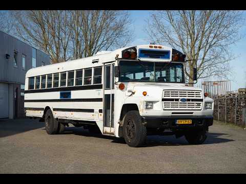 The seller offers for sale this 1992 Ford School Bus, a distinctive American-style passenger bus designed for comfortable group transport. This vehicle is powered by a 6.6-liter six-ylinder diesel engine combined with an automatic transmission. The bus has seating capacity for 36 passengers and features tables that allow passengers to sit facing each other, creating a social interior layout suitable for events or group travel. The vehicle is also equipped with a 500-watt amplifier and a radio with CD and Bluetooth connectivity. The body shows visible dents and scratches and there is a hole in the rear emergency door. The black side strips are damaged in several places and could be replaced. Some rust is present around the rear emergency door and in a few smaller areas.. The interior, including upholstery, floor and ceiling, shows normal signs of use but remains comfortable for passengers.